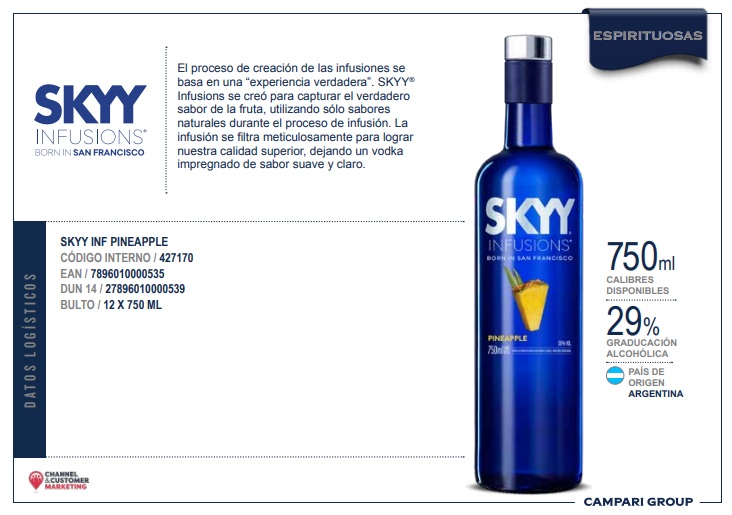 Especificaciones para Vodka Skyy Pineapple 29º 750cc
