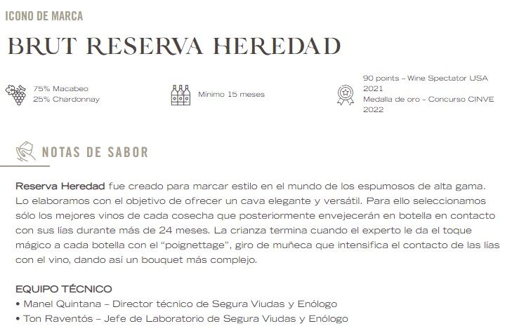 Especificaciones para Cava Segura Viudas Brut Heredad Estuche 1x750cc