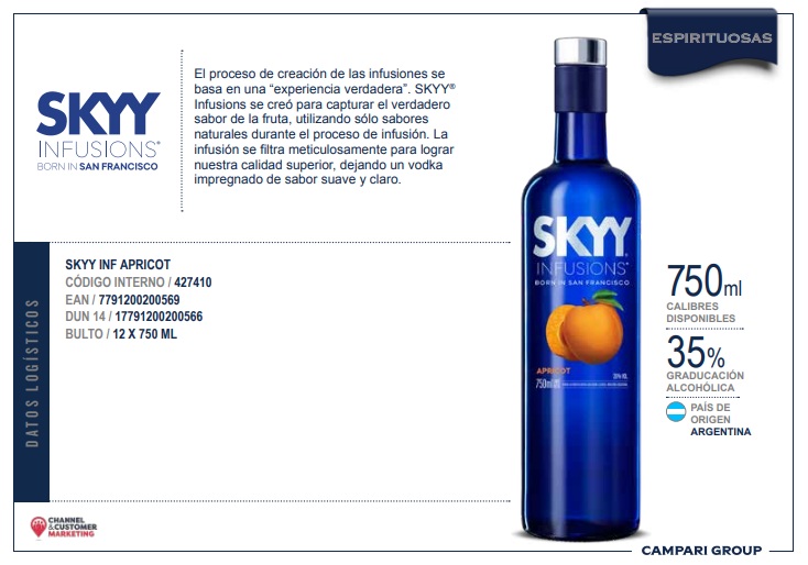 Especificaciones para Vodka Skyy Apricot 29º 750cc