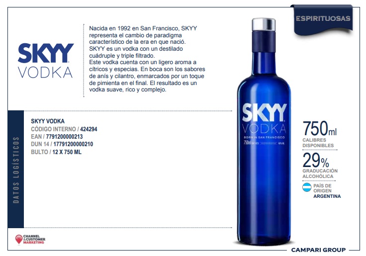 Especificaciones para Vodka Skyy Regular 40º 750cc
