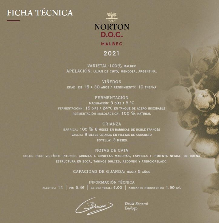 Especificaciones para Norton Malbec DOC 750cc