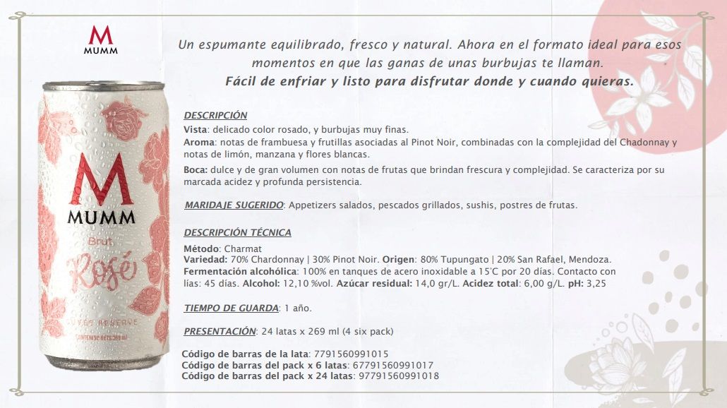 Especificaciones para Mumm Brut Rose Lata 269cc