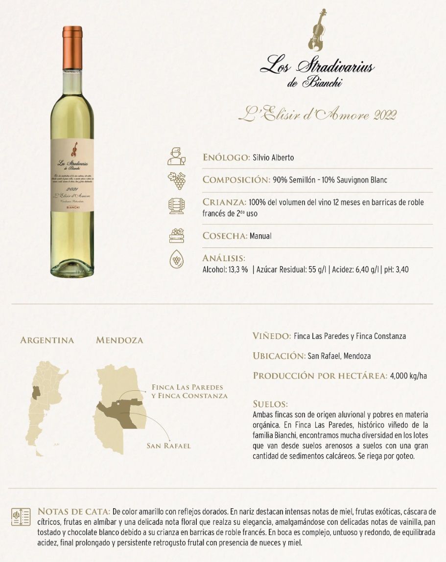 Especificaciones para Los Stradivarius L Elisir D Amore Semillon 13.30° 500cc